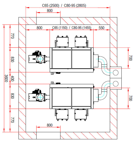 Mindestmaße: HDG Compact Kaskade im Pelletbetrieb mit Pellet-Saugsystem.